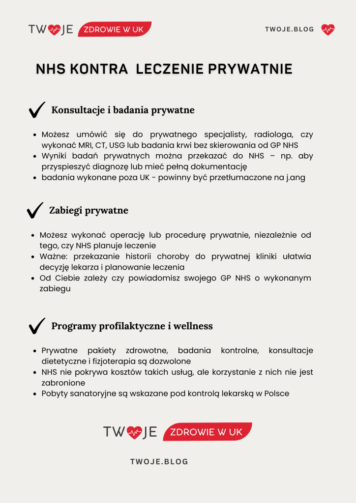 W praktyce wiele osób decyduje się na prywatną opiekę, aby skrócić czas oczekiwania na diagnozę lub uzyskać szybszy dostęp do specjalisty. Takie działania są w pełni legalne i często stanowią wsparcie dla dalszego leczenia prowadzonego przez NHS. Co ważne, pacjent może przekazać wyniki badań wykonanych prywatnie swojemu lekarzowi GP w NHS. Lekarz ma prawo je uwzględnić, jeśli uzna je za klinicznie przydatne i zgodne z obowiązującymi standardami.