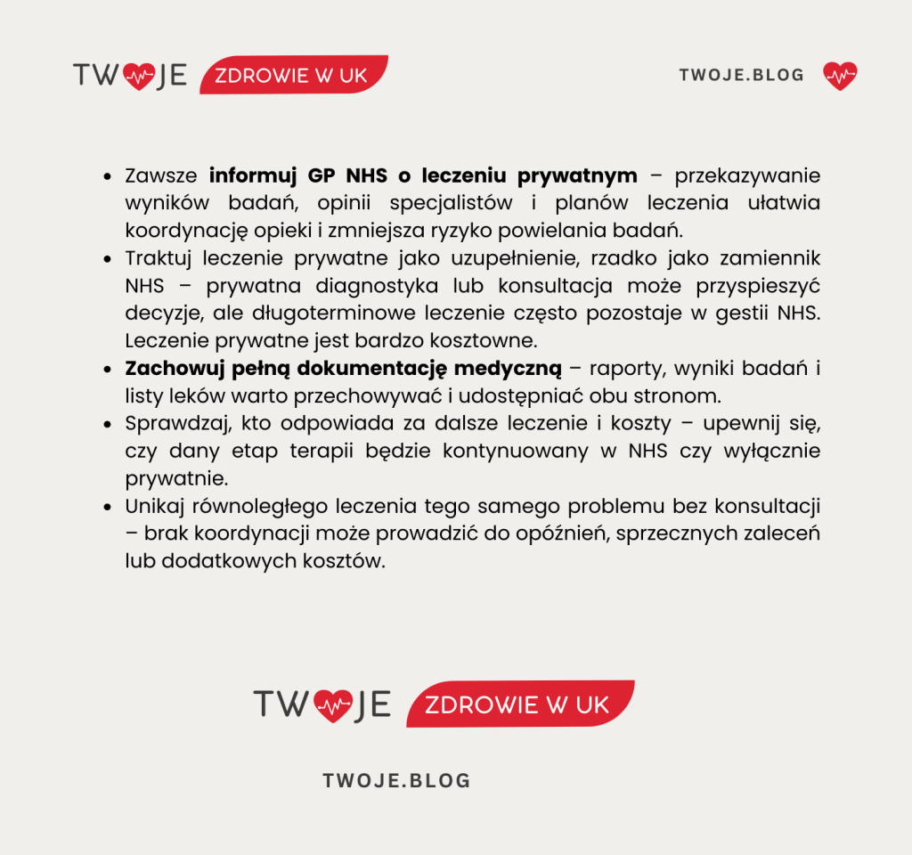 Takie podejście może znacząco poprawić komfort i tempo leczenia, pod warunkiem że jest prowadzone w sposób świadomy i dobrze skoordynowany. Kluczowe znaczenie ma jasne rozdzielenie usług NHS i prywatnych, otwarta komunikacja z lekarzem GP oraz zrozumienie, kto odpowiada za dalsze leczenie i koszty. Dzięki temu pacjent może bezpiecznie korzystać z zalet obu systemów, unikając niepotrzebnych komplikacji organizacyjnych i finansowych.